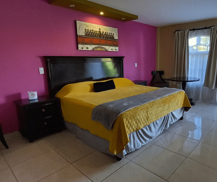La habitación es más amplia cuenta con una cama king size, baño equipado, secadora de cabello, closet, 2 sillas, una mesa, 2 cobertores, tocador con espejo, aire acondicionado, alfombrado, televisión y una ventana para apreciar una hermosa vista
