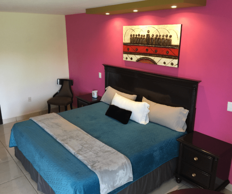 Una de las habitaciones cuenta con una cama king size, 1 televisión, 2 cobertores, tocador con espejo, closet y baño todo equipado con tina.